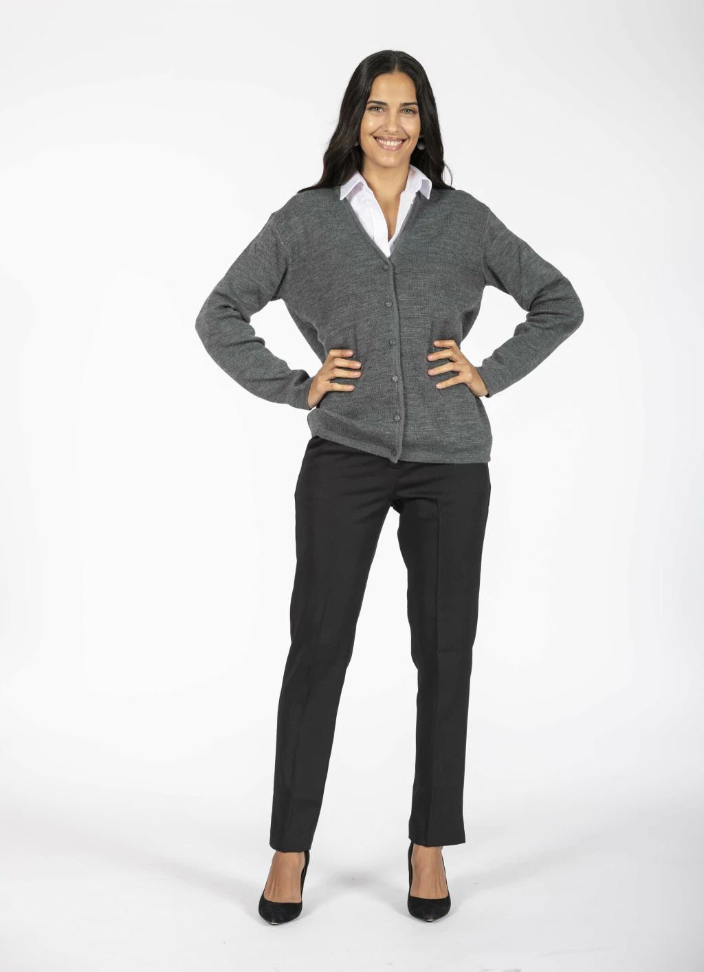Cárdigan abotonado gris. Uniformes para trabajo